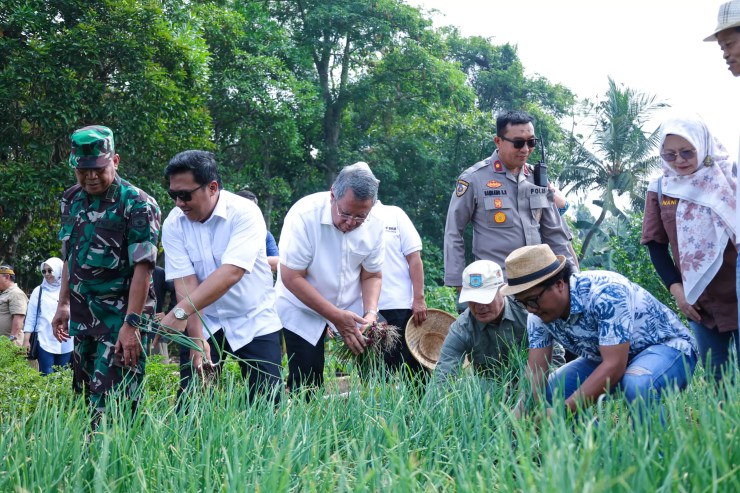 Wali Kota Tangerang Selatan Benyamin Davnie memanen berbagai jenis hasil tanaman, mulai dari jagung pulut, talas, cabai hingga bawang merah, di Saung Baba Kimpo, Parigi Baru, Pondok Aren, Sabtu (04/11).