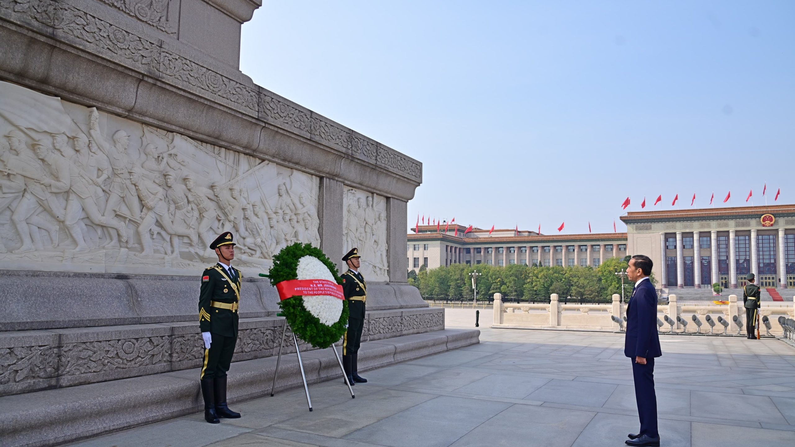Presiden Joko Widodo mengunjungi Monumen Pahlawan Rakyat, Tiananmen Square di Beijing, Republik Rakyat Tiongkok (RRT) pada Selasa, 17 Oktober 2023 untuk melakukan peletakan karangan bunga atau flower tribute. Kegiatan tersebut merupakan bagian dari kunjungan Presiden Jokowi ke RRT.